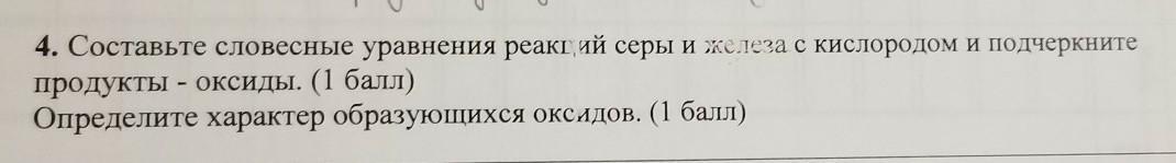 Составьте словесное уравнение реакции серы и железа с кислородом и подчеркните продукты-оксиды
