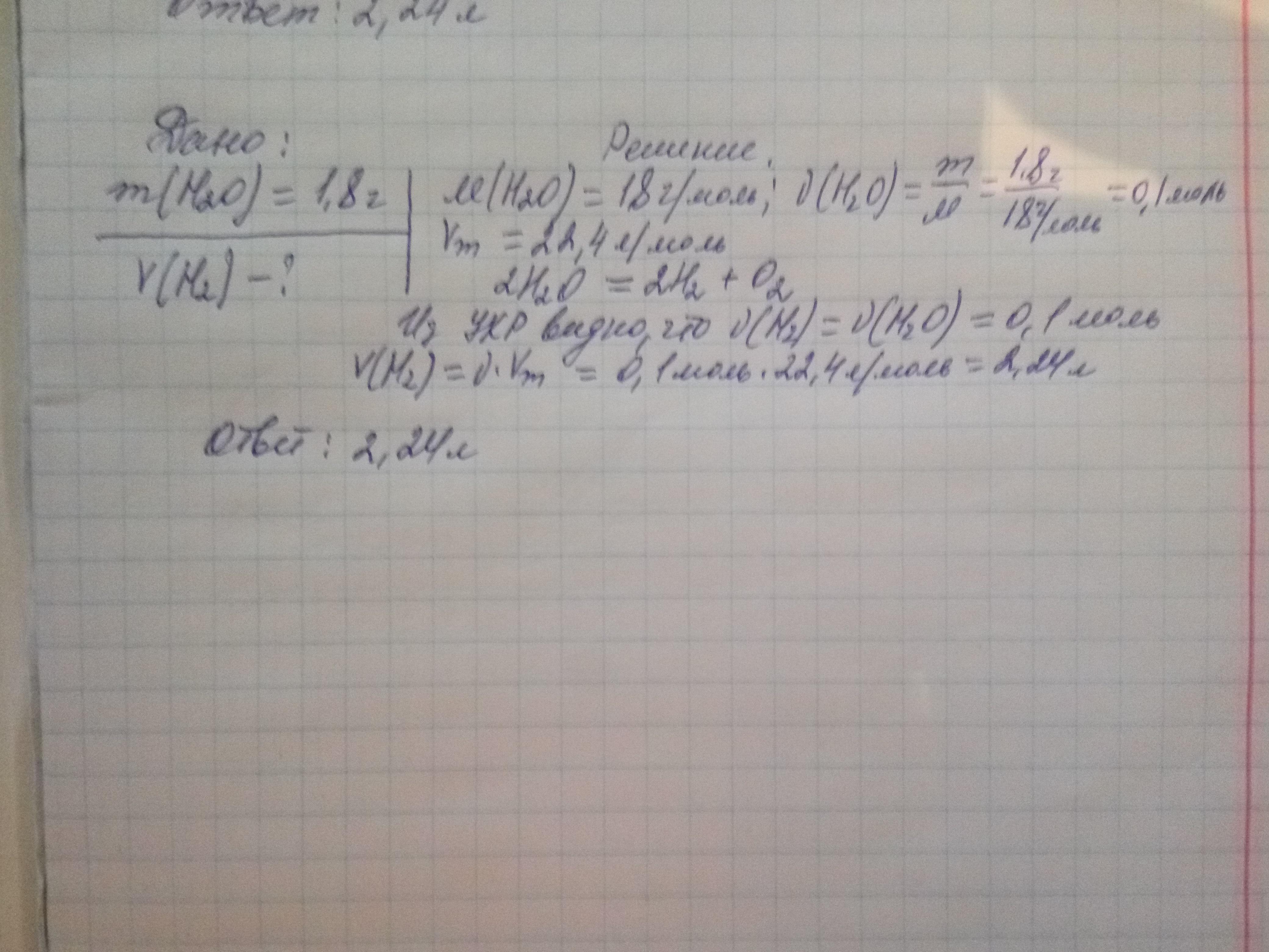 При разложении воды массой 1,8г. Объём выделяющегося водорода