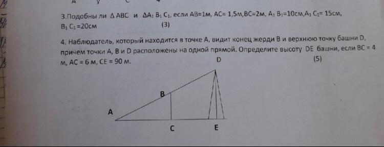 4. АЕ=6+90=96, прямоугольные тр-ки ∆АВС и ∆АDE подобны, значит ДЕ/ВС=АЕ/АС, искомая ДЕ=96*4/6=64 м -ответ