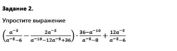 (a⁻⁵/(a⁻⁵-6) -(2a⁻⁵)/(a⁻¹⁰-12a⁻⁵+36))·(36-a⁻¹⁰)/(a⁻⁵-8) +(12a⁻⁵)/(a⁻⁵-6)=(a⁻⁵/(a⁻⁵-6) -(2a⁻⁵)/(a⁻⁵-6)²)·((6-a⁻⁵)(6+a⁻⁵))/(a⁻⁵-8) +(12a⁻⁵)/(a⁻⁵-6)=(a⁻⁵·(a⁻⁵-6)-2a⁻⁵)/(a⁻⁵-6)²·((a⁻⁵-6)(6+a⁻⁵))/(8-a⁻⁵) +(12a⁻⁵)/(a⁻⁵-6)=((a⁻¹⁰-6a⁻⁵-2a⁻⁵)(6+a⁻⁵))/((a⁻⁵-6)(8-a⁻⁵)) +(12a⁻⁵)/(a⁻⁵-6)=(a⁻⁵(a⁻⁵-8)(6+a⁻⁵))/((6-a⁻⁵)(a⁻⁵-8)) -(12a⁻⁵)/(6-a⁻⁵)=(6a⁻⁵+a⁻¹⁰)/(6-a⁻⁵) -(12a⁻⁵)/(6-a⁻⁵)=(6a⁻⁵+a⁻¹⁰-12a⁻⁵)/(6-a⁻⁵)=(a⁻¹⁰-6a⁻⁵)/(6-a⁻⁵)=(-a⁻⁵·(a⁻⁵-6))/(a⁻⁵-6)=-a⁻⁵=-1/a⁵