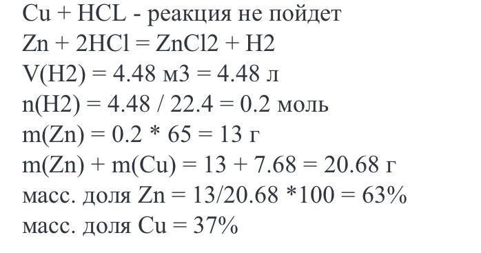 762. А г смеси меди и цинка обработали избытком соляной кислоты. При этом выделилось Б л газа, измеренного при температуре 7°C и давлении 2 атм. Вычислите массу меди и цинка в смеси.