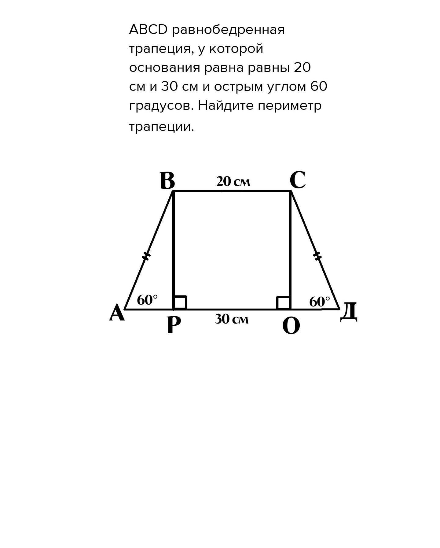 ABCD равнобедренная трапеция, у которой основания равна равны 20 см и 30 см и острым углом 60 градусов. Найдите периметр трапеции.