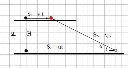 Чтобы попасть в ту же точку, куда прибежит бегун, катер должен двигаться с собcтвенной скоростью v₂ под углом α к направлению, противоположному течению реки. В этом направлении катер за время t пройдёт путь