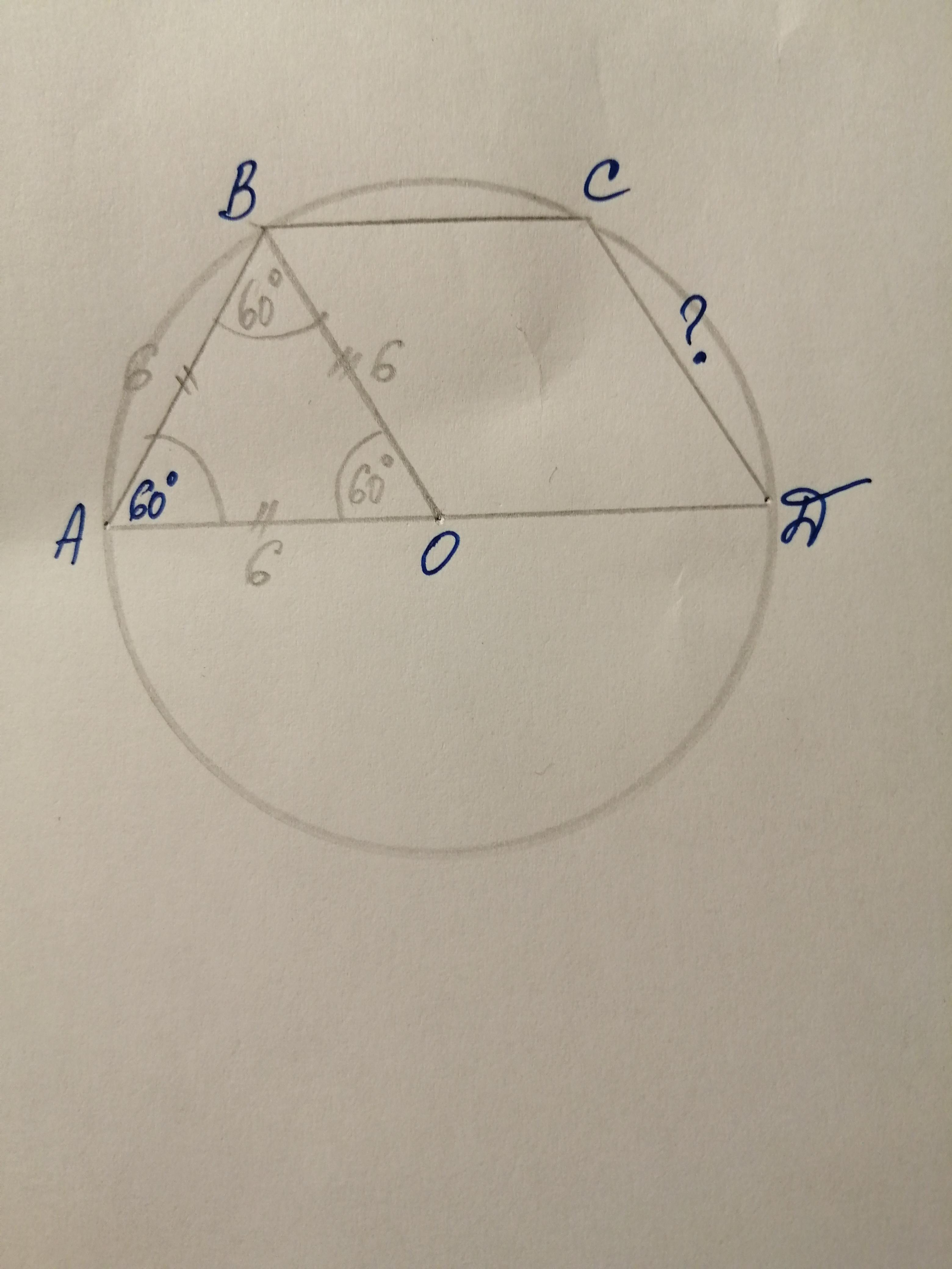Трапеция ABCD вписана в окружность,A=60°.Центр окружности лежит на большем основании AD трапеции,равном 12 см.Найдите длину стороны CD