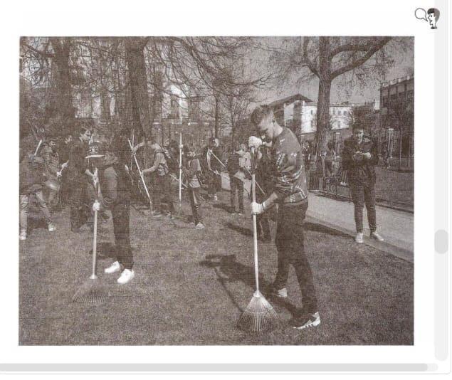 на картине мы видим трудящихся ребят. Кто то сгребает листья, а кто то только подошел и готов приступить к работе. ребята трудятся не покладая рук. сразу замечаешь их командную работу.