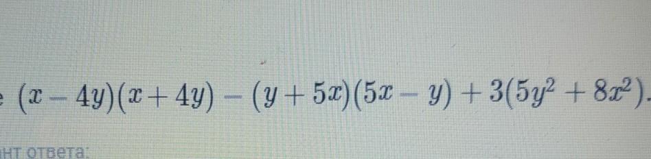 (x-4y)(x+4y)-(y+5x)(5x-y)+3(5y^2+8x^2)\\(x-4y)(x+4y)+(y+5x)(y-5x)+3(5y^2+8x^2)\\x^2-16y^2+y^2-25x^2+15y^2+24x^2\\-24x^2-15y^2+15y^2+24x^2=0