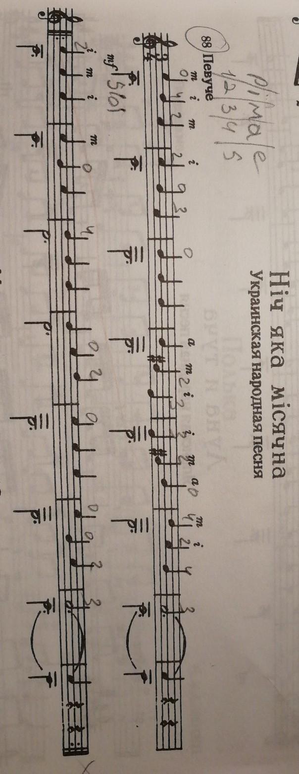 35БАЛЛОВ! Нiч яка мiсячна. Переведите пожалуйста 2 строки нот на русский язык! Всмысле чтобы вместо палочек было "Ми (бас 5 струна), ре, до|