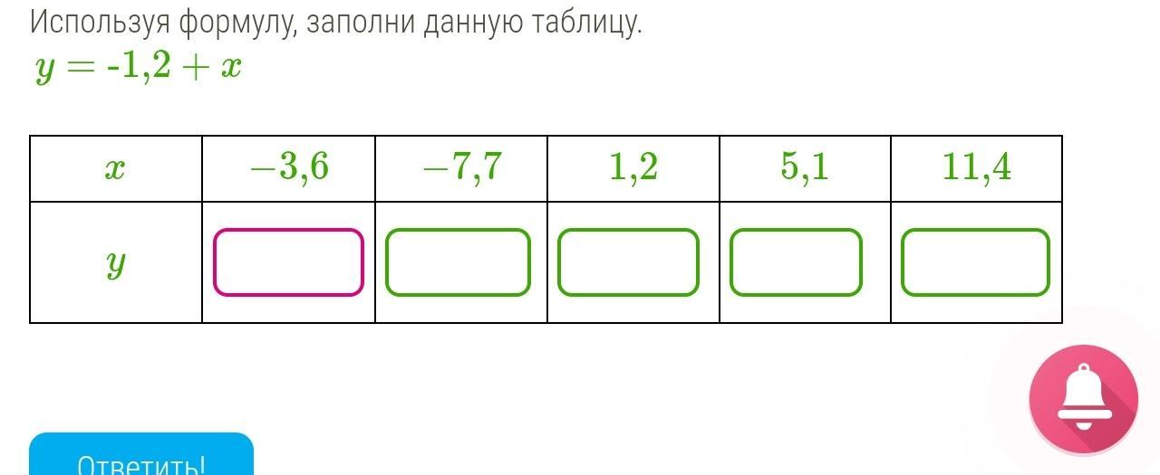 x= 11,4 ; y=-1,2 +x= - 1,2 +11,4= 10,2