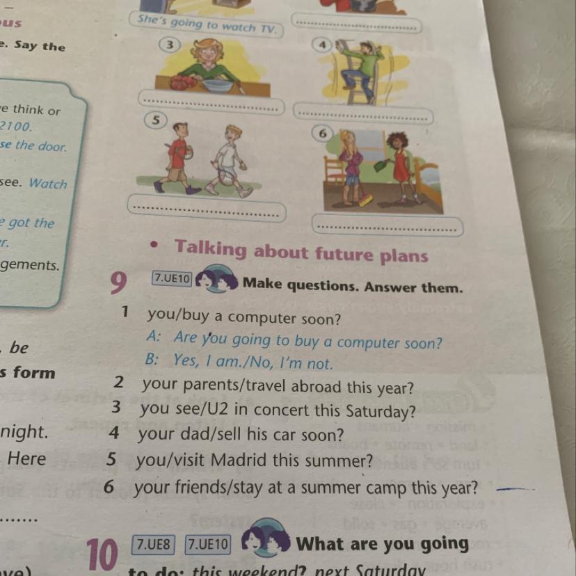 2. Are your parents going to travel abroad this year? No, they aren't. 3. Are you going to see U2 in concert this Saturday? No, I'm not. 4. Is your dad going to sell his car soon? Yes, he is. 5. Are you going to visit Madrid this summer? No, I'm not. 6. Are your friends going to stay at a summer camp this year? Yes, they are.