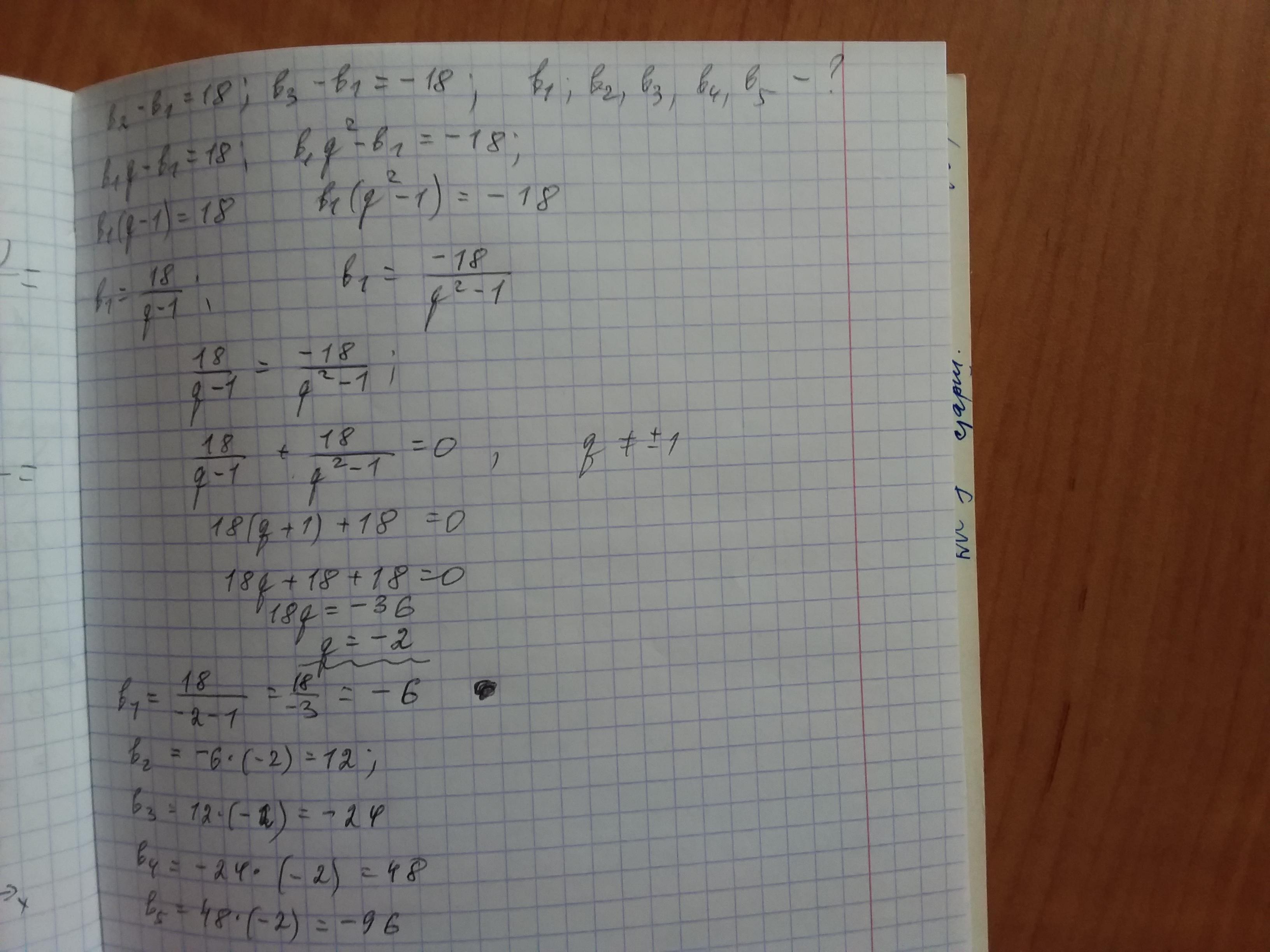 даю 35 баллов , b2-b1=18 b3-b1=-18 надо найти b1 и первые пять b