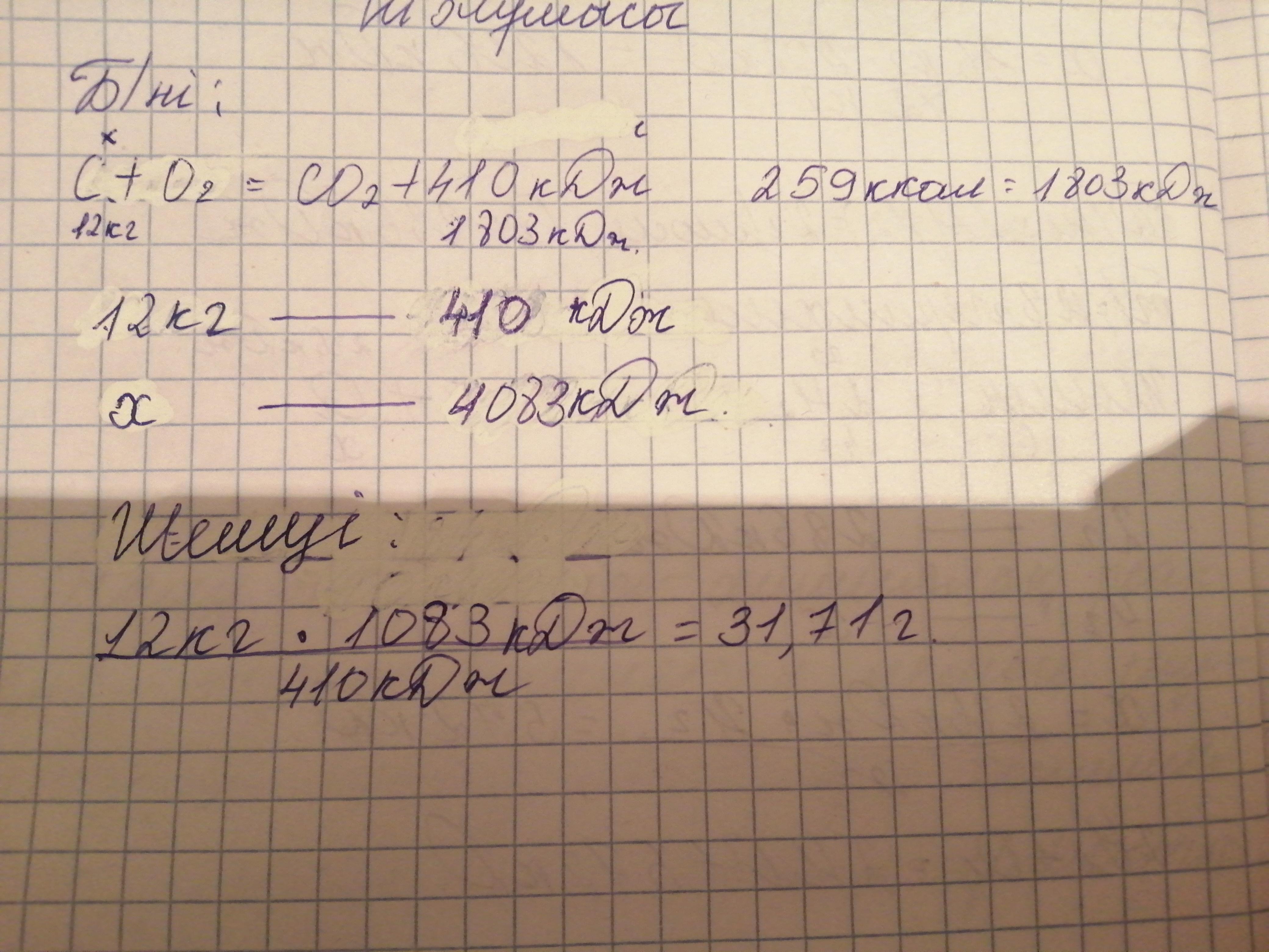 адам 100 г шоколад жегенде 259 ккал (1ккал=4,184 кДж) энергия алады. Осынша көлемдегі жылу бөліну үшін таза көмірдің қандай массасын ауада жағу қажет екенін есептеңдер. Реакция ның жылу эффектісі 410 кДж екені белгілі.