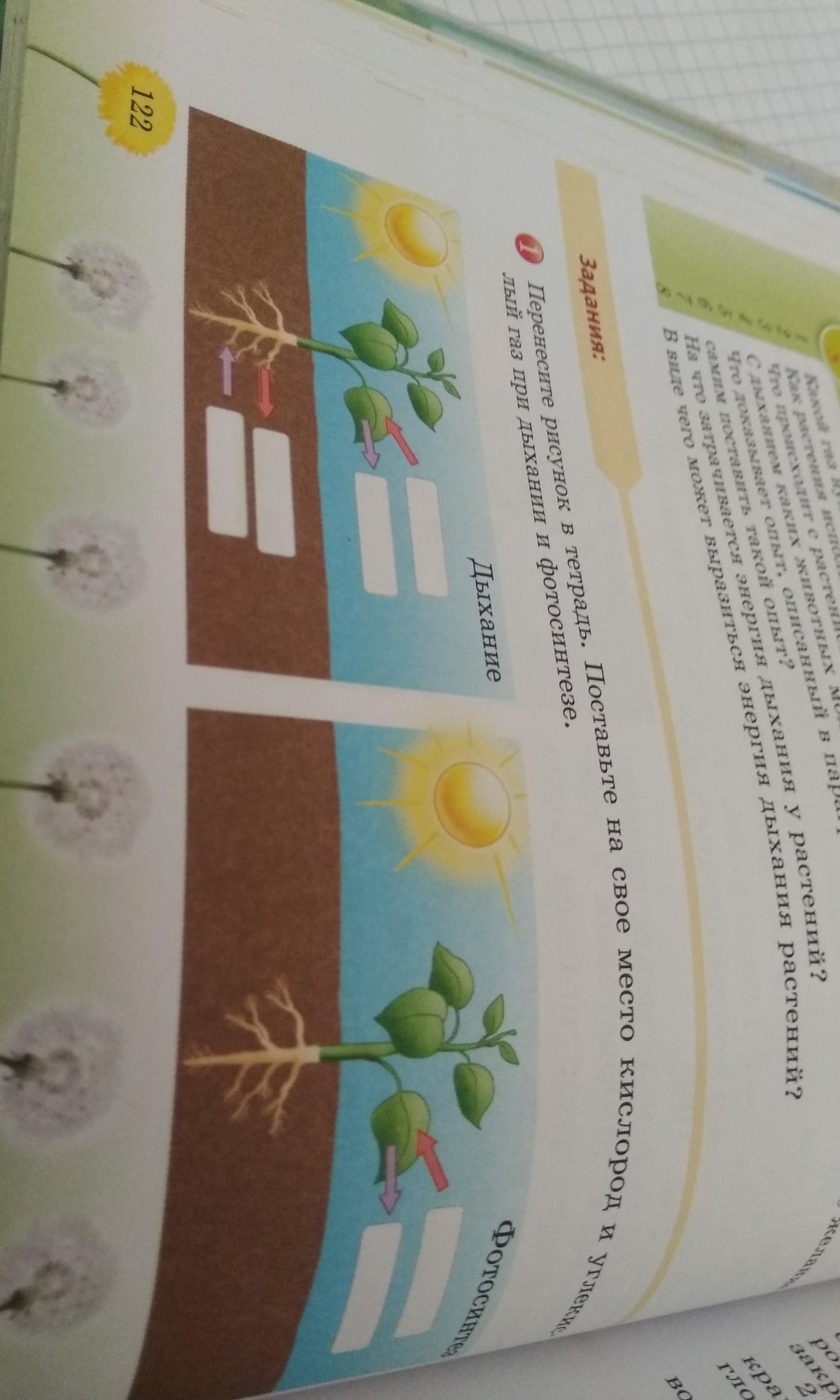 перенесите рисунок в тетрадь. поставьте на свое место кислород и углекислый газ при дыхании и фотосинтезе