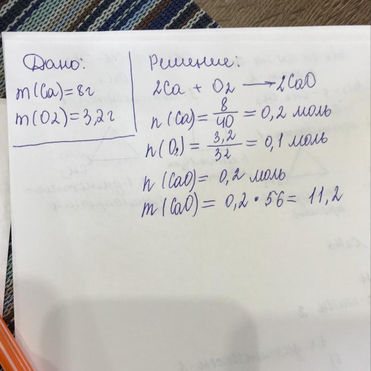 Сколько граммов оксида кальция получают при взаимодействии 8 граммов кальция и 3,2 грамма кислорода?