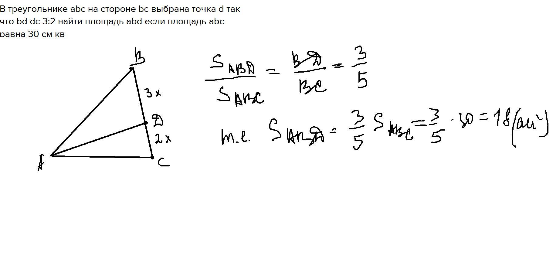 в треугольнике abc на стороне bc выбрана точка d так что bd dc 3:2 найти площадь abd если площадь abc равна 30 см кв