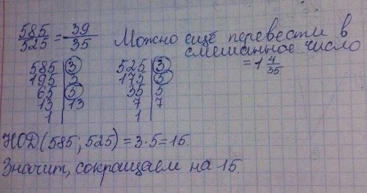 Если нам дана дробь (или получилась такая), что сразу не получается сказать на какое же число нужно разделить числитель и знаменатель, для того, чтобы сократить дробь, легче всего использовать нахождение НОД (наибольшего общего делителя), т.е. как раз наибольшего числа, на которое делятся данные два числа, путём разложения на простые множители.