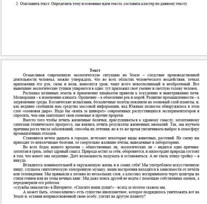 идея текста: осветить современные проблемы экологии Земли; какие проблемы существуют на данный момент; рассуждение на счёт проблемы экологии нашей планеты; появление новых болезнетворных и опасных бактерий/вирусов.