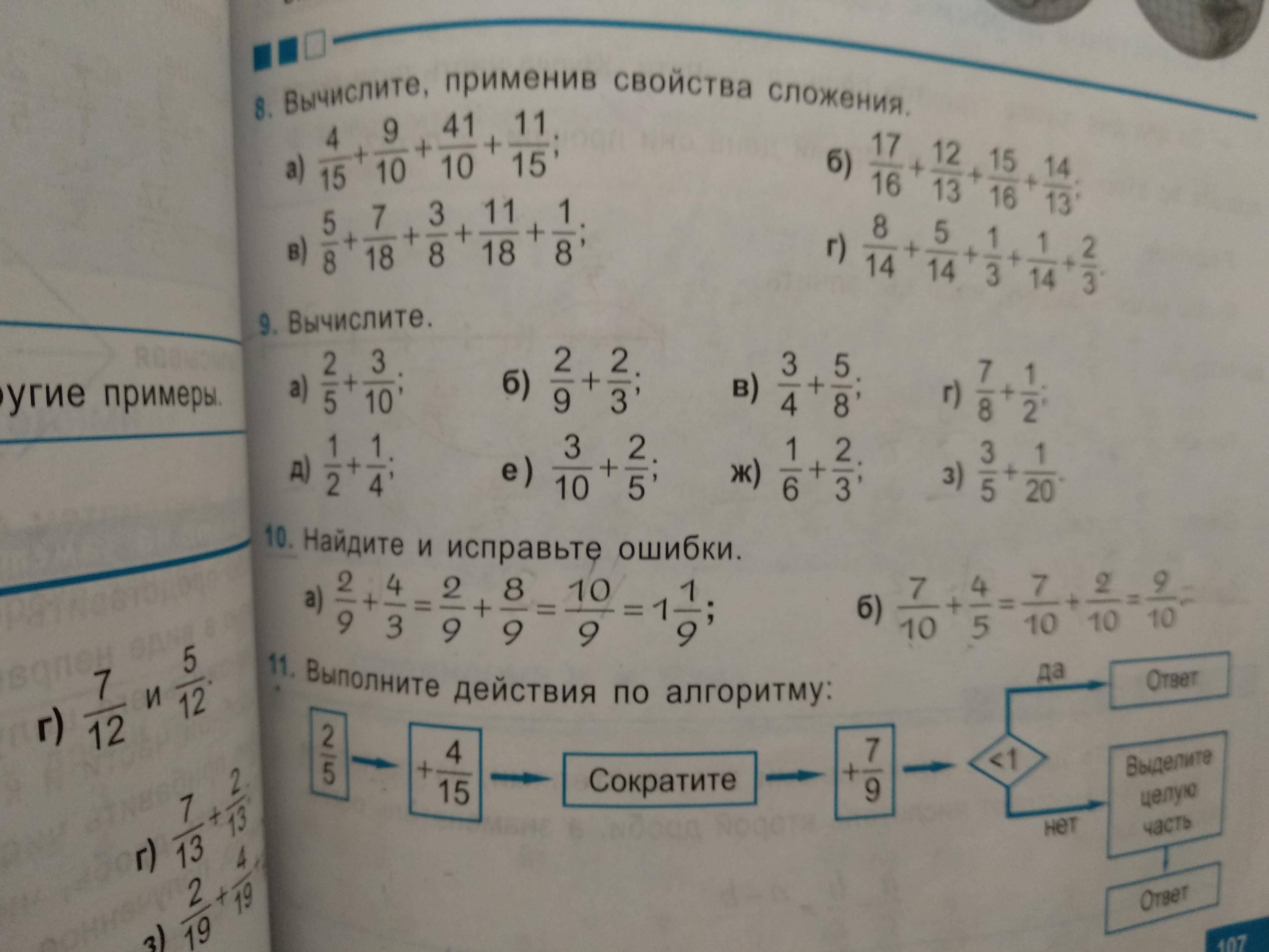 Ну тут к общему знаменателю. 4/10+3/10=7/10. Д)2/4+1/4=3/4=0,75. Б)2/9+6/9=8/9 е)3/10+2/5=3/10+4/10=7/10=0,7 в) 3/4+5/8=6/8+5/8=11/8=1 3/8 Ж)1/6+2/3=1/6+4/6=5/6,Г)7/8+1/2=7/8+4/8=11/8=1 3/8 З)3/5+1/20=12/20+1/20=13/20 Ну вроде так