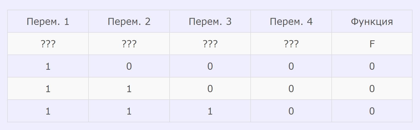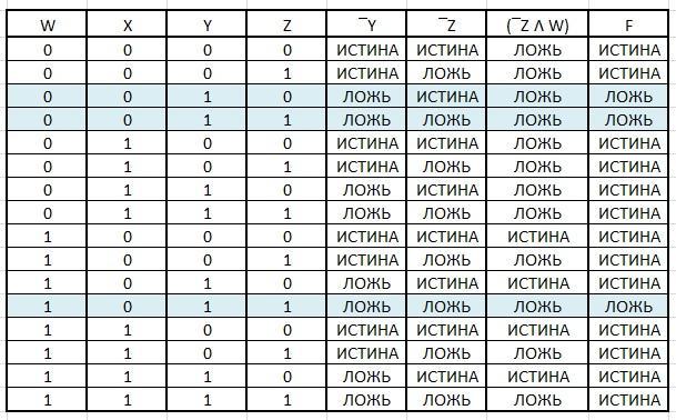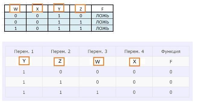 Логическая функция F задаётся выражением ¬y ∨ x ∨ (¬z ∧ w). На рисунке приведён фрагмент таблицы истинности функции F, содержащий все наборы аргументов, при которых функция F ложна. Определите, какому столбцу таблицы истинности функции F соответствует каждая из переменных x, y, z, w.