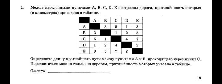 A-B-C-E-F. Длина маршрута 4 + 6 + 4 + 5 = 19
