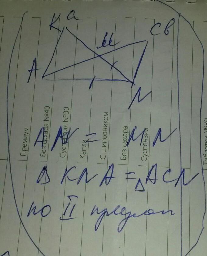 Две прямые пересекаются в точке М, точки А и М лежат на 1 прямой так,что AN = MN и угол NAK = углу NMC.