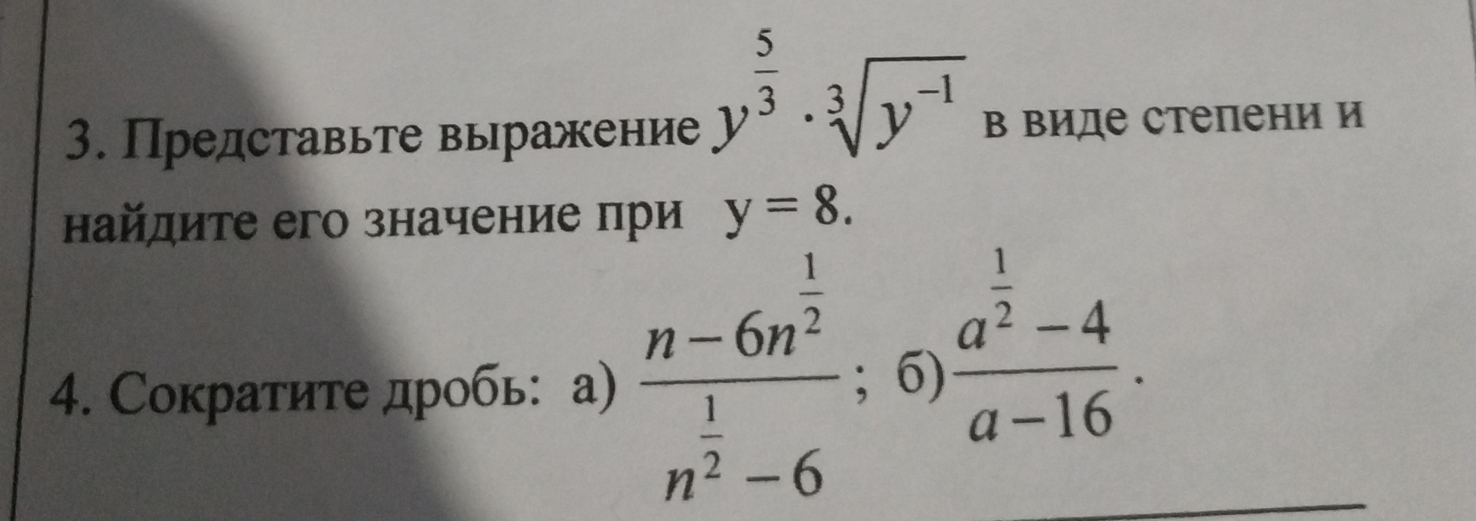 4) Представьте выражение y^5/3 × ^3√y^-1 в виде степени и найдите его значение при y = 8 , 5) Сократите дробь.