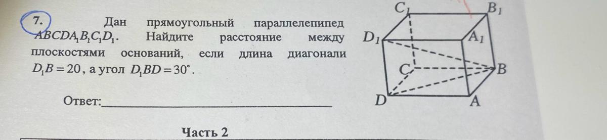 DD1 = BD* sin30° = 20 * 0.5 = 10 - высота - ответ.