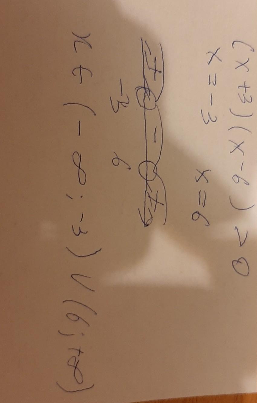 Ответ: неравенство равно нулю при х1=-3 и х2=6. Искомый интервал при х>6 и х<-3.