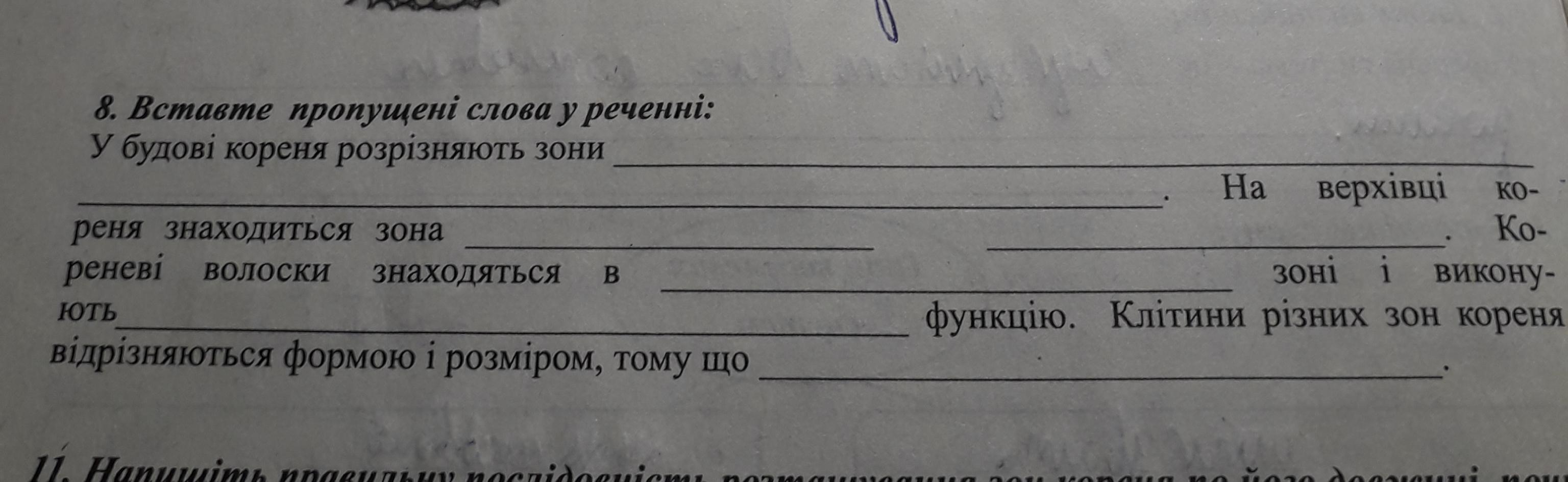 Ответ: у будові кореня розрізняють зони кореневий чохлик, зона поділу клітин, зона росту, всисна зона, провідна зона. На верхівці кореня знаходиться зона кореневого чохлика. Кореневі волоски знаходяться у всисній зоні і виконують полгинальну функцію. Клітини різних зон кореня відрізняються формою і розмірами, тому що у них різне розташування і різні функції