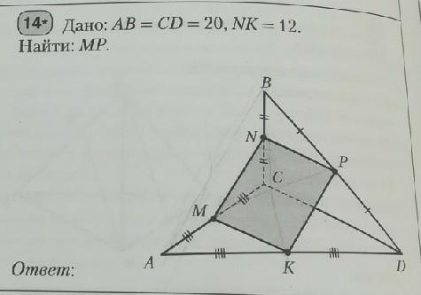 МNPK-параллелограмм (можно через определение или признак) Дальше не доказывая до того что он ромб (и не используя теорему Пифагора для нахождения половины диагонали) , просто по формуле- сумма квадратов диагоналей параллелограмма равна удвоенной сумме квадратов его двух смежных сторон