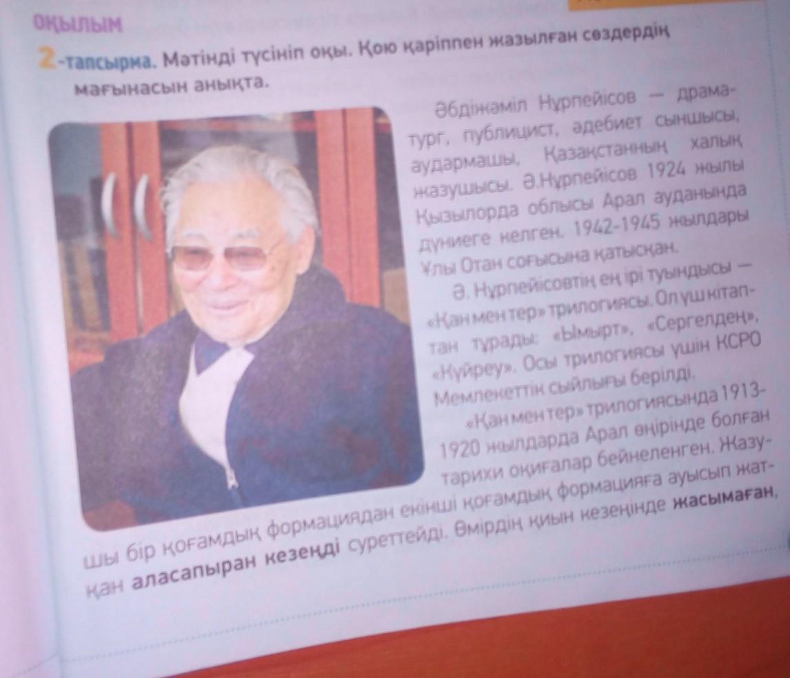 Абжамил Нурнейсов - драматург. публицист, литературовед, переводчик, эмоции народов Казани. В 1924 году Е. Н. Апнейсов был убит в Приаралье Кызылординской области. В 1942-1945 годах участвовал в Улы-Отан Сорина. Произведение Нурпеисова - «Тип крови: трилогия. Она из класса: "Дочь", "Серкальдин" и "Корнеу". За эту трилогию она была награждена Мемлекетом СССР. Трилогия «Меч крови» описывает исторические события, произошедшие в Аральском море в 1913–1920 годах. Письмо иллюстрирует ошеломляющий ход перехода от одной социальной формации к следующей форме общества, но не к оригиналу.
