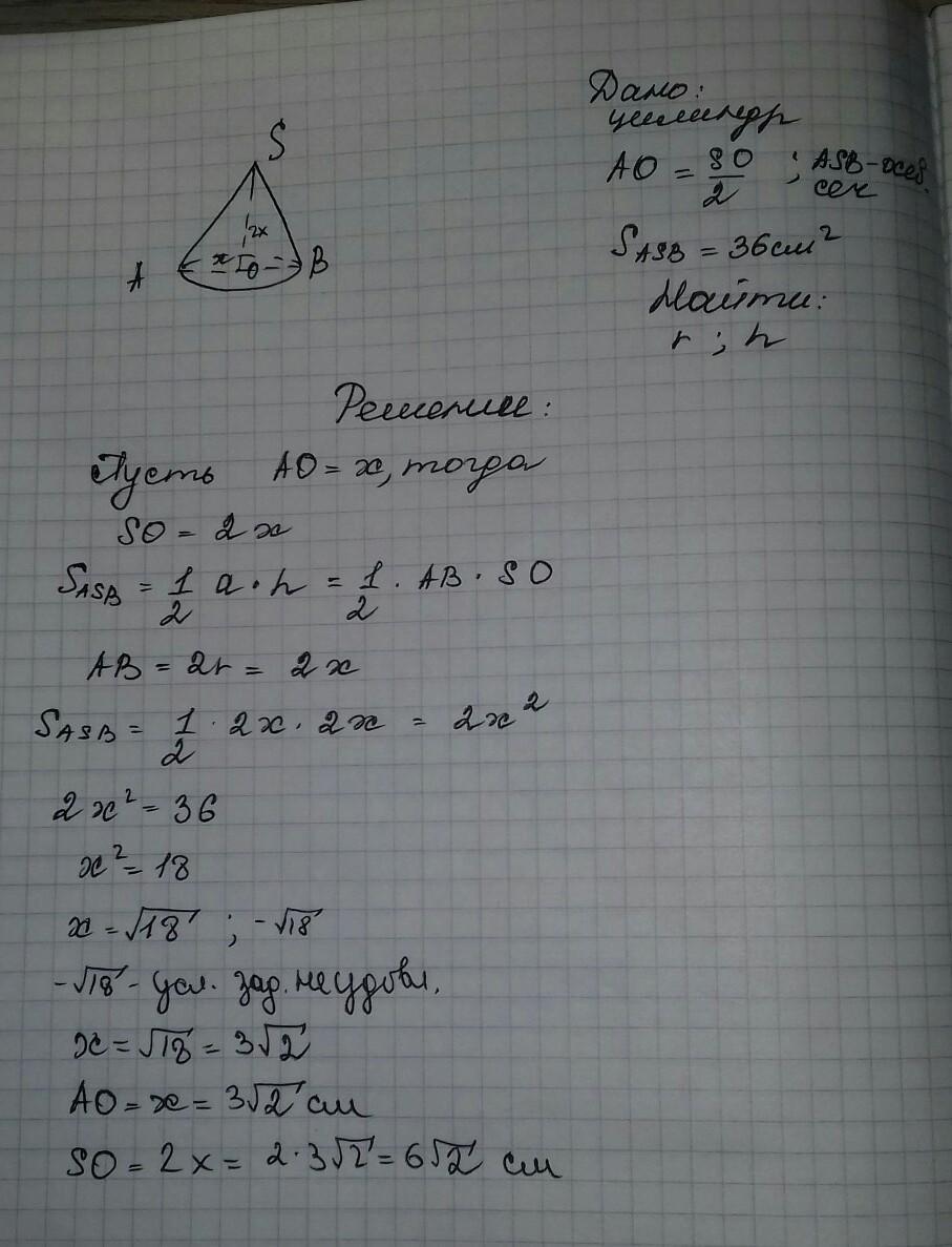 Висота цилиндра вдвое больше его радиуса,а площадь осевого сечения 36см2. Найдите радиус и высоту цилиндра.