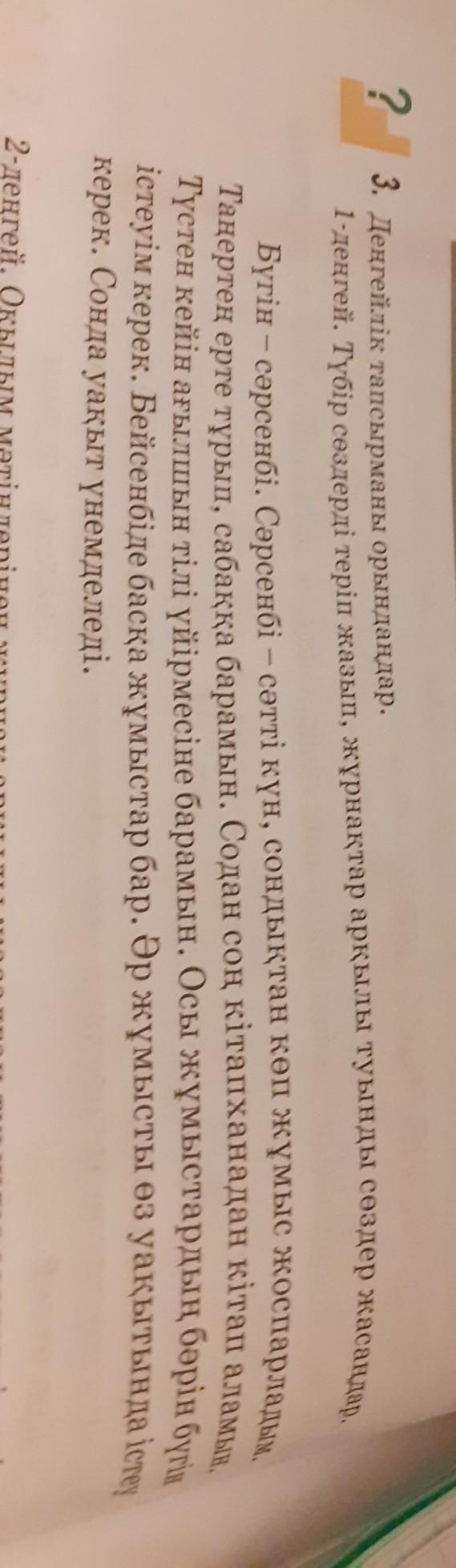 Түбір:бүгін,сәрсенбі,сәт,күн,сондықтан,көп,жұмыс,жоспар,таңертең,ерте,тұр,сабақ,бар,содан,соң,кітап,аламын,түс,кейін,ағылшын,тіл,үйірме,бар,осы,жұмыс,бәрі,бүгін,істеу,керек,бейсенбі,басқа,жұмыс,бар,әр,жұмыс,өз,уақыт,істеу,керек,сонда,уақыт үнемделеді ал туынды дегенды блмим