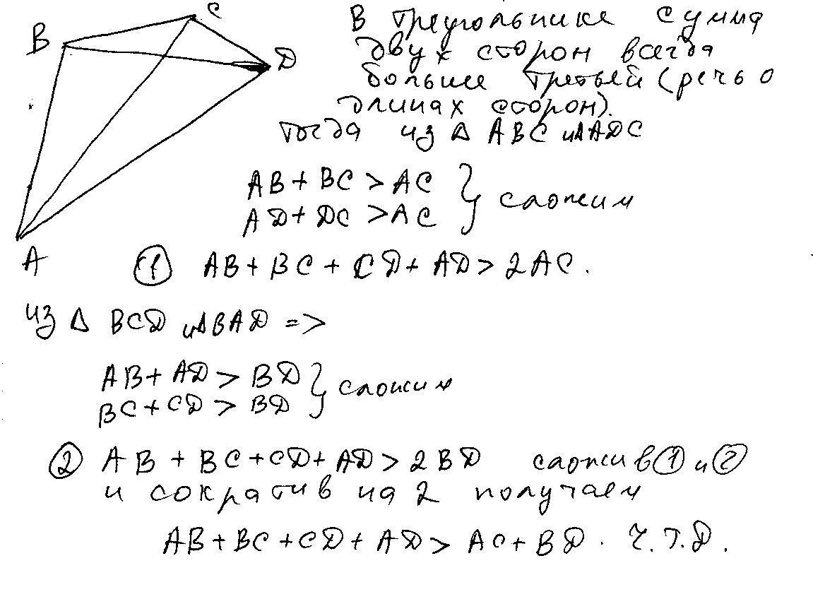 Дан четырёхугольник ABCD.Определите,что больше:периметр четырёхугольника или сумма длин его диагоналей РЕШЕНИЕ