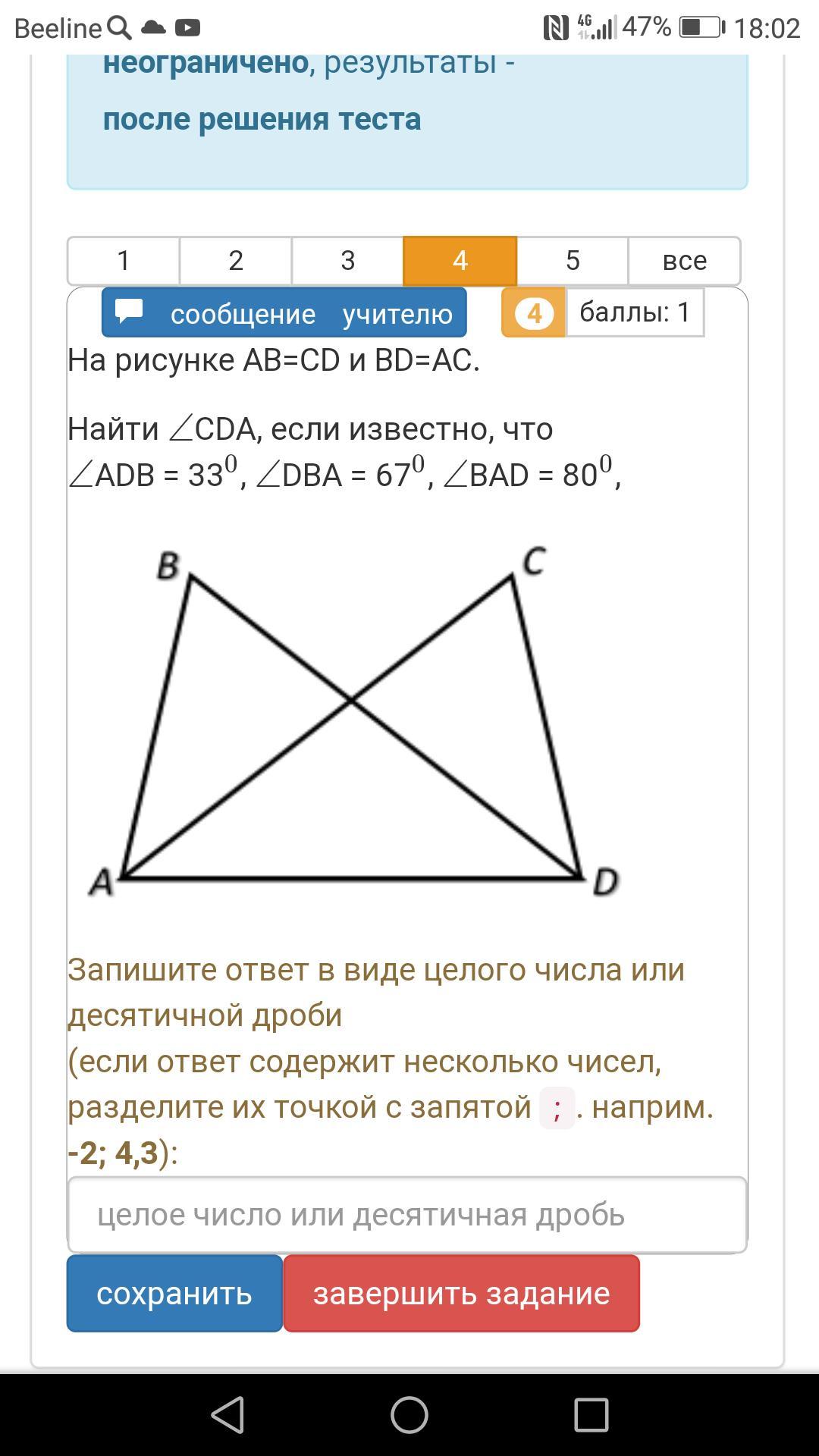 Так как АВ=СD AC=BD, а AD общая, то треугольники равны по 3 признаку следовательно угл CDA=углу BAD =80°