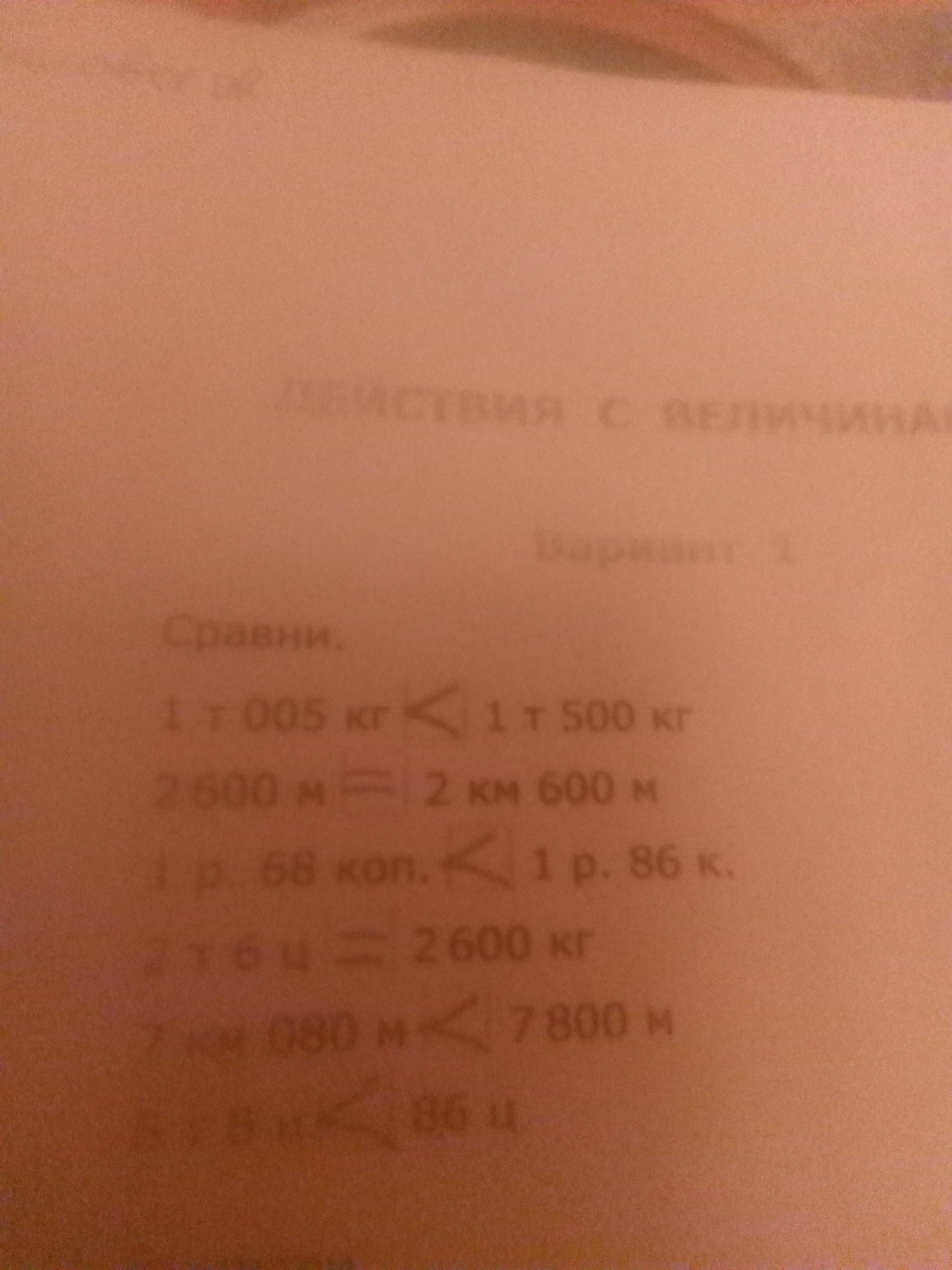 Сравни. 1т 005кг?1т 500кг, 2600м?2км 600м,1р.68коп?1р.86к, 2т 6ц?2600кг, 7км 080м?7800м, 6т 8ц?86ц