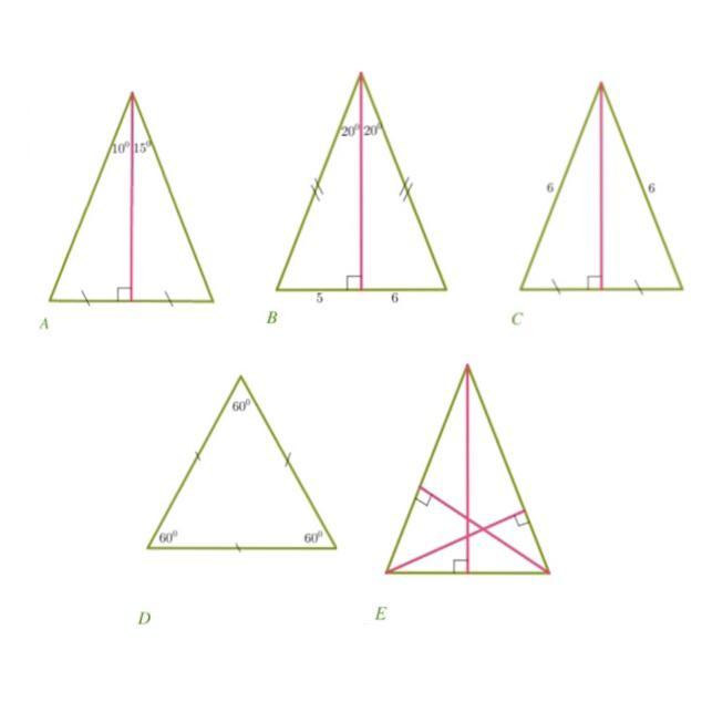Даны рисунки пяти треугольников, на которых дана некоторая информация об углах и отрезках. На которых рисунках информация дана правильно?