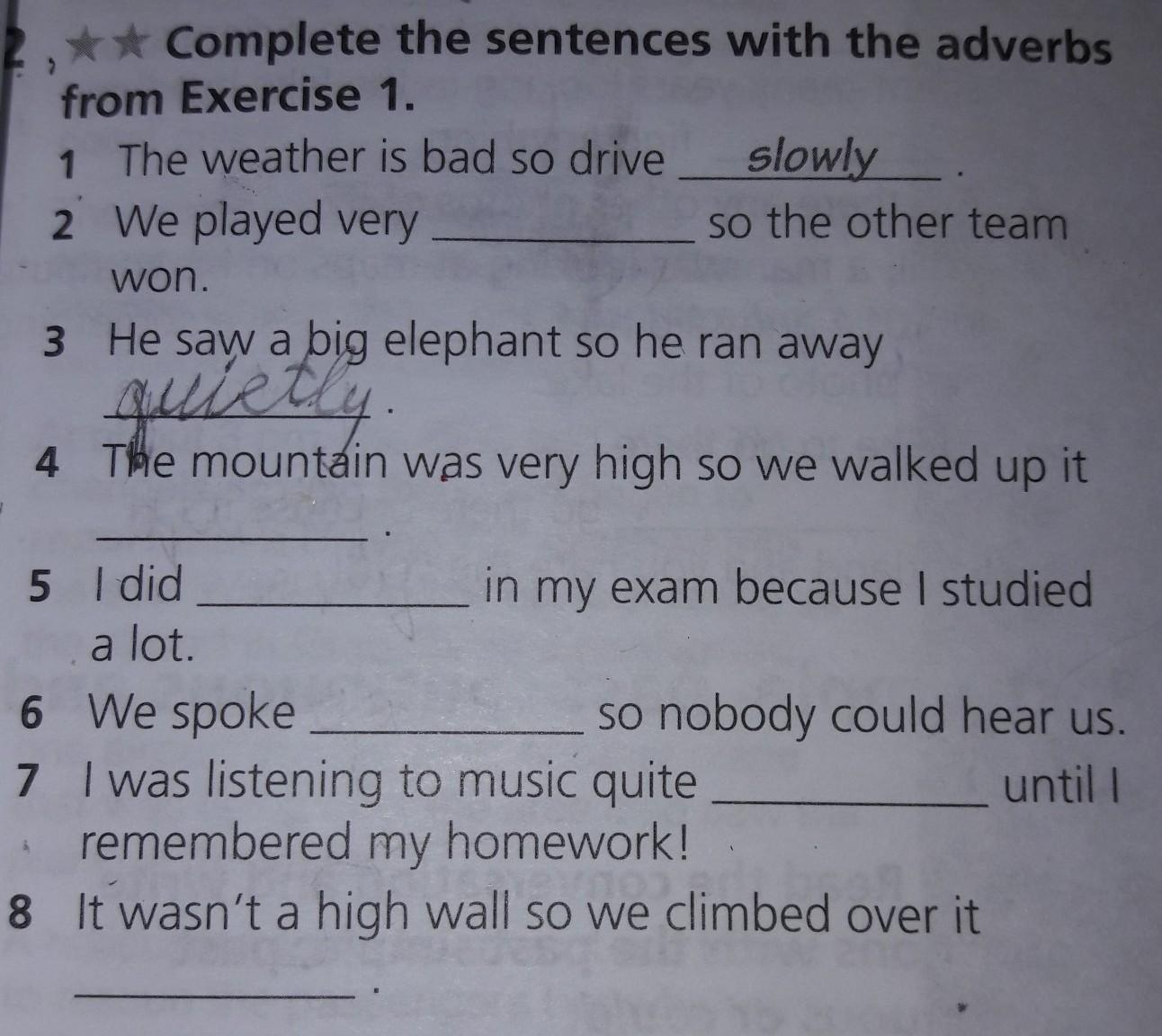 3. quickly (там было у тебя quietly - это неправильно, поэтому поменяй его на quickly)