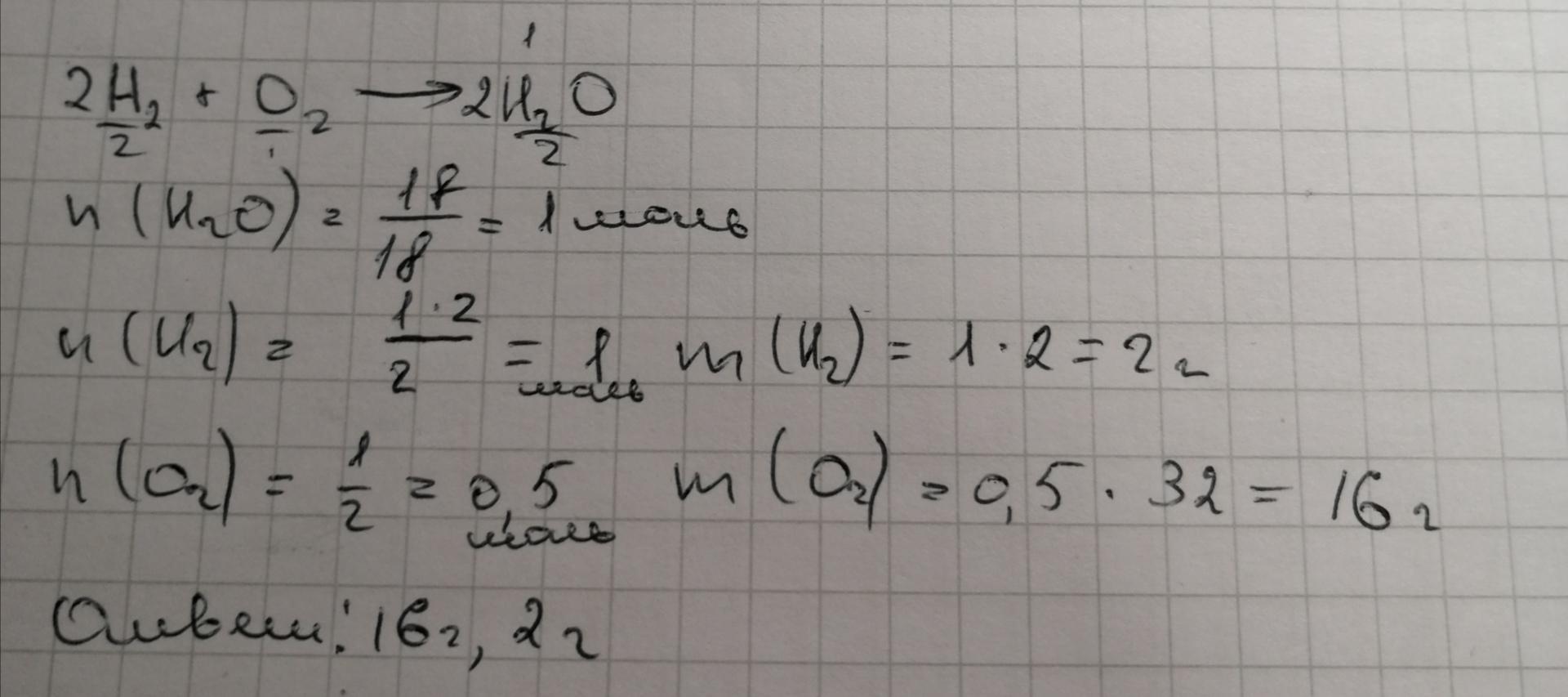 Получить 18 грамм воды, сколько грамм понадобится кислорода, сколько грамм водорода?