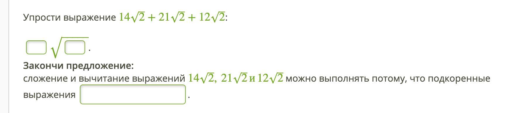 Сложение и вычитание выражений 14√2 , 21√2 , и 12√2 можно выполнять потому, что подкоренные выражения равны.