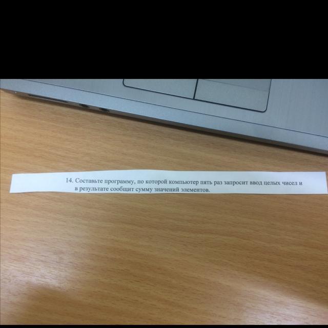 14. Составьте программу, по которой компьютер пять раз запросит ввод целых чисел и в результате сообщит сумму значений элементов.