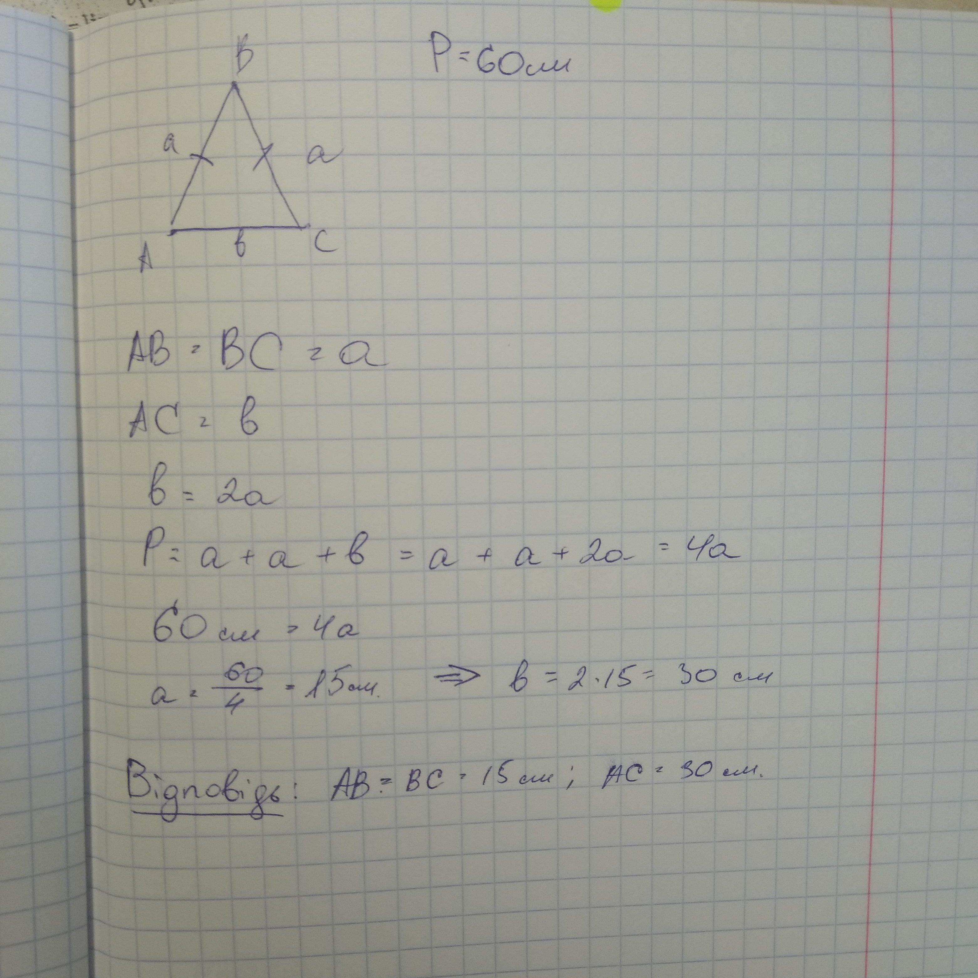 Периметр равнобедренного треугольника =60 см, основание в 2 раза больше боковой стороны. Найти все стороны.