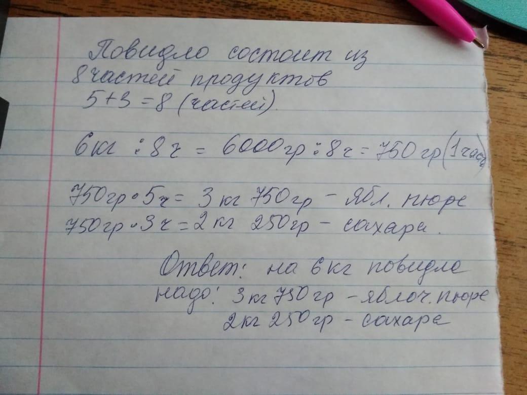 Для приготовления яблочного повидла на 5 частей массы яблочного пюре берут 3 части массы сахара. Сколько яблочного пюре и сколько сахара потребуется, чтобы подготовит 6 кг смеси?