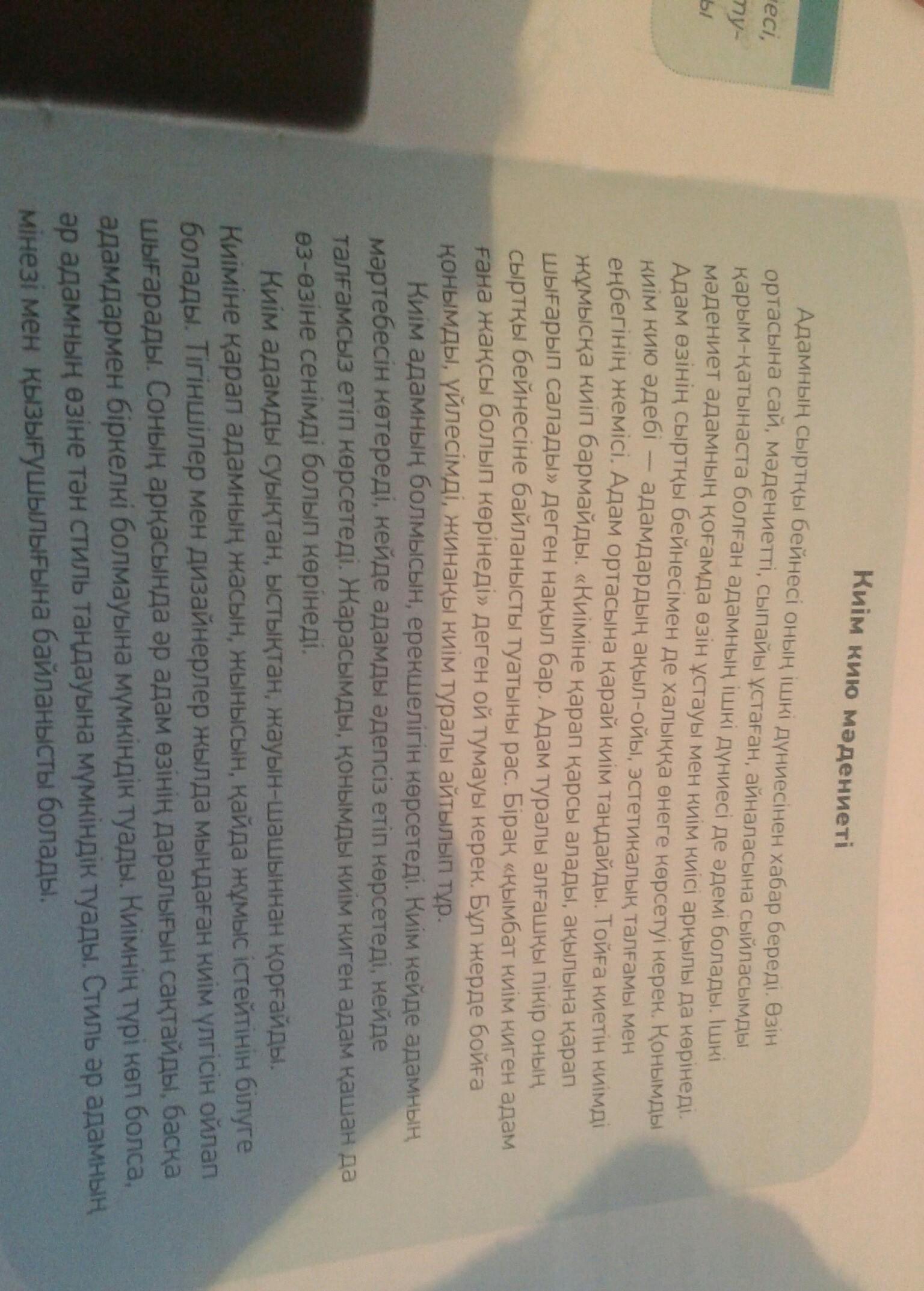 1)Адамнын ишки жане сырткы дуниеси кандай болады? 2) Адам конымды кийим кигенде кандай болады? 3)Кандай Адам кандай кийим кисе жаксы болады? 4)осы жерде не туралы айтылып тур? 5)кийим ол нени корсетеди? 6)кийим адамды кандай гылып корсетеди?