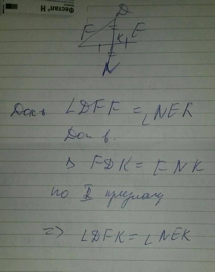Прямые FE и DN пересекаются в точке К так что FK=KE, DK=KN. Докажите что угол DFK =УГЛУ NEK