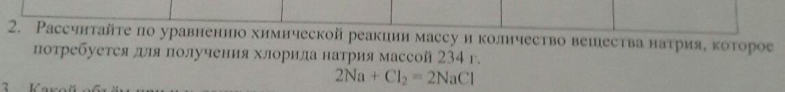 Срочно! Рассчитайте по уравнению химической реакции массу и количество вещества натрия, которое потребуется для получения хлорида натрия массой 234 г. 2Na + Cl2 = 2NaCl