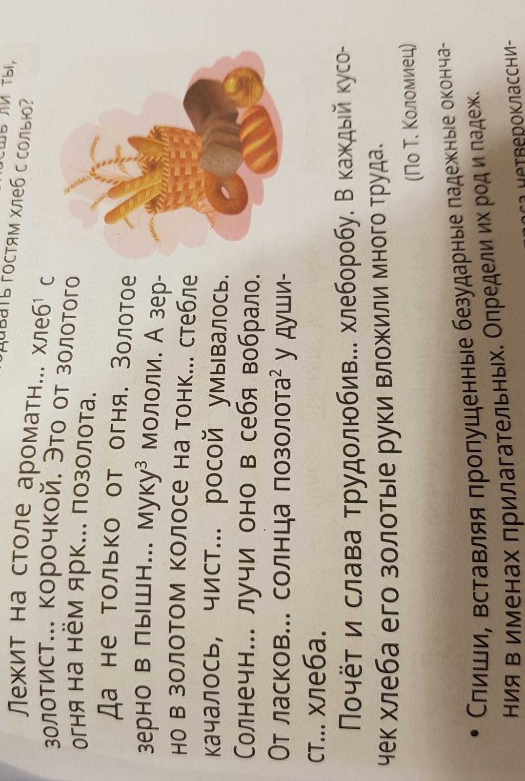 Лежит на столе ароматный (прил., муж.р., Им.п.) хлеб с золотистой (прил., жен.р., Тв.п.) корочкой. Это от золотого огня на нем яркая (прил., жен.р., Им.п.) позолота.