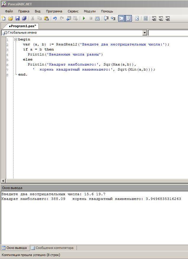 var (a, b) := ReadReal2('Введите два неотрицательных числа:');