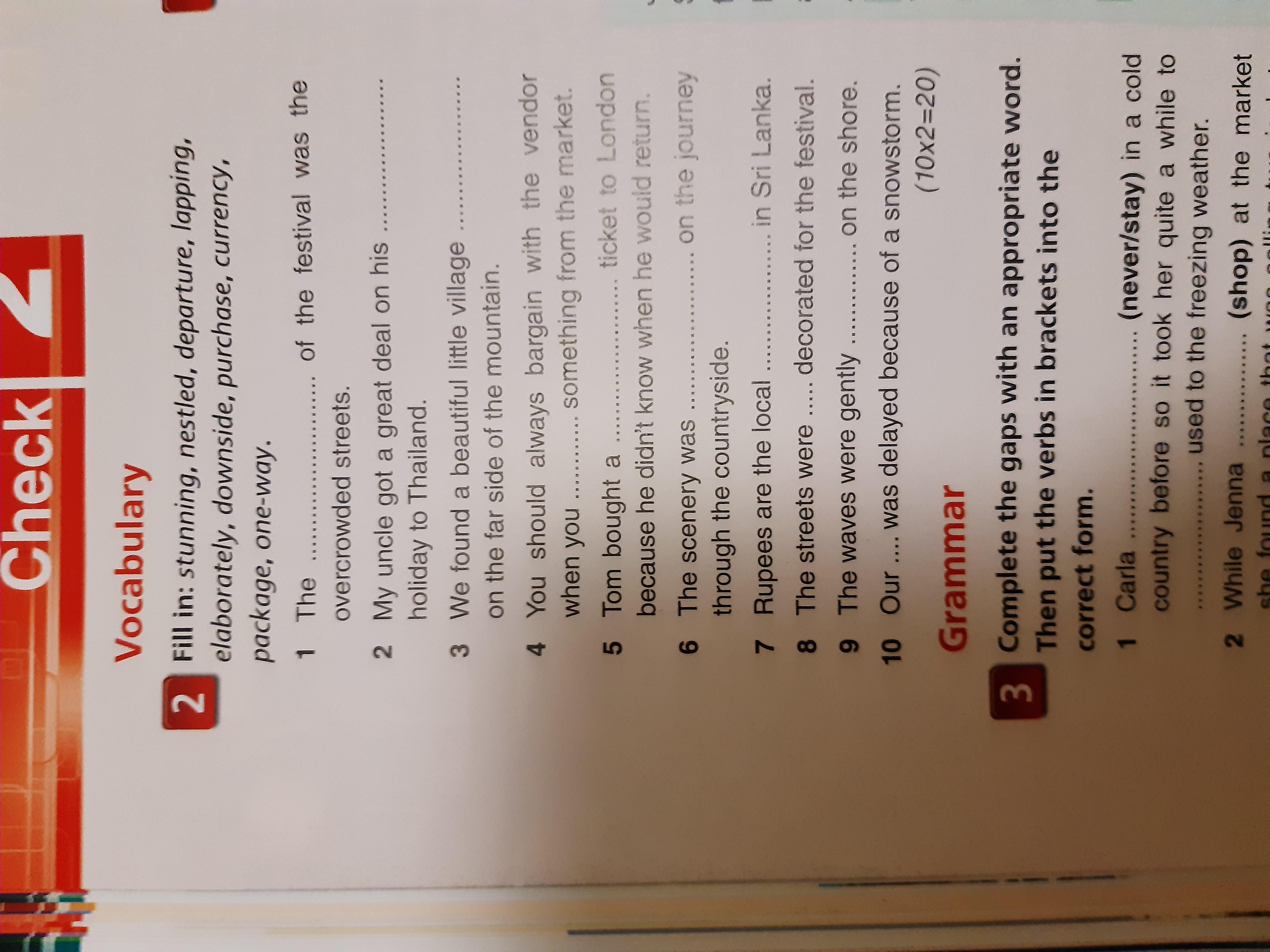 Fill in: stunning, nestled, departure, lapping, elaborately, downside, purchase, currency, package, one-way.