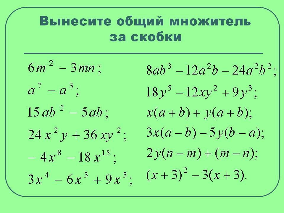 Ответ:1)6m2-3mn=3m(2m-n);2)a7-a3=a3(a4-1);3)15ab2-5ab=5ab(3ab-1);