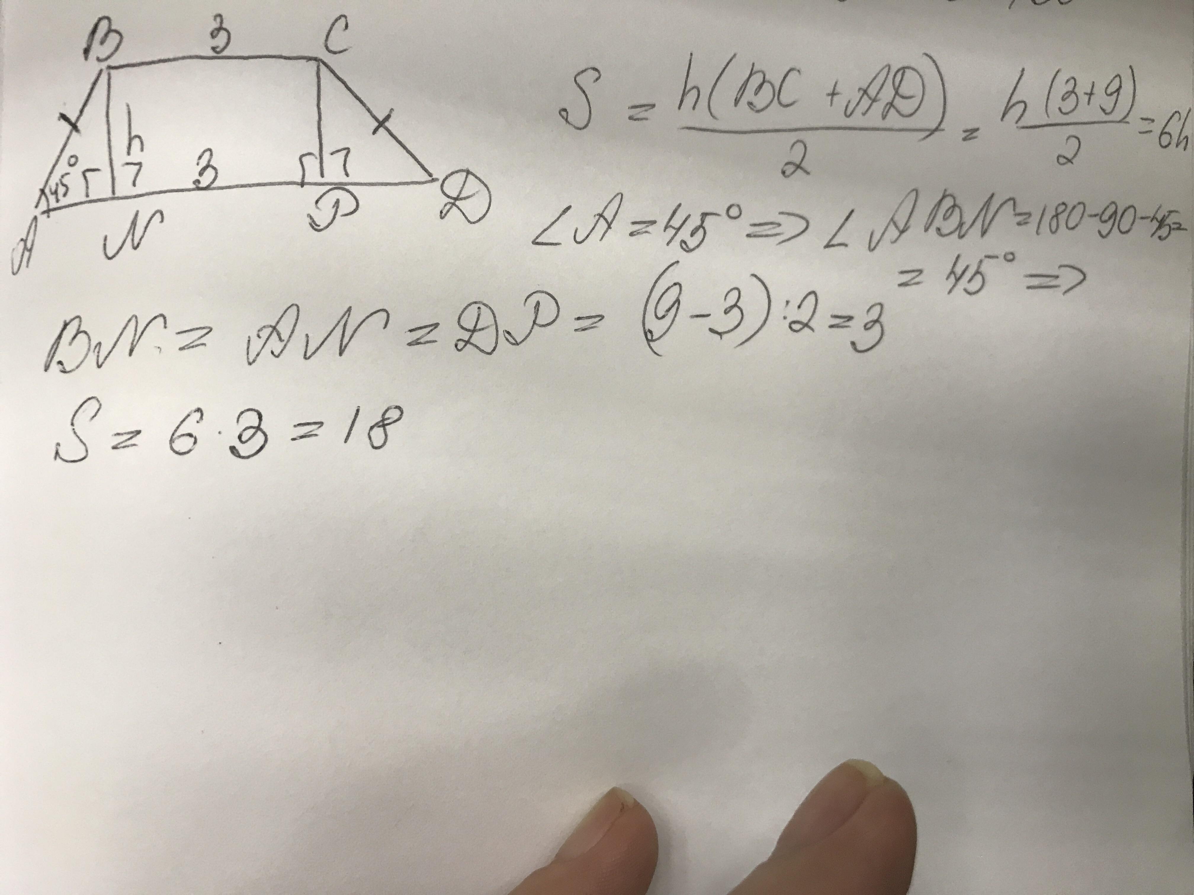 В равнобедренной трапеции основания равны 3 и 9, а один из углов между боковой стороной и основанием равен 45°. Найдите площадь трапеции.